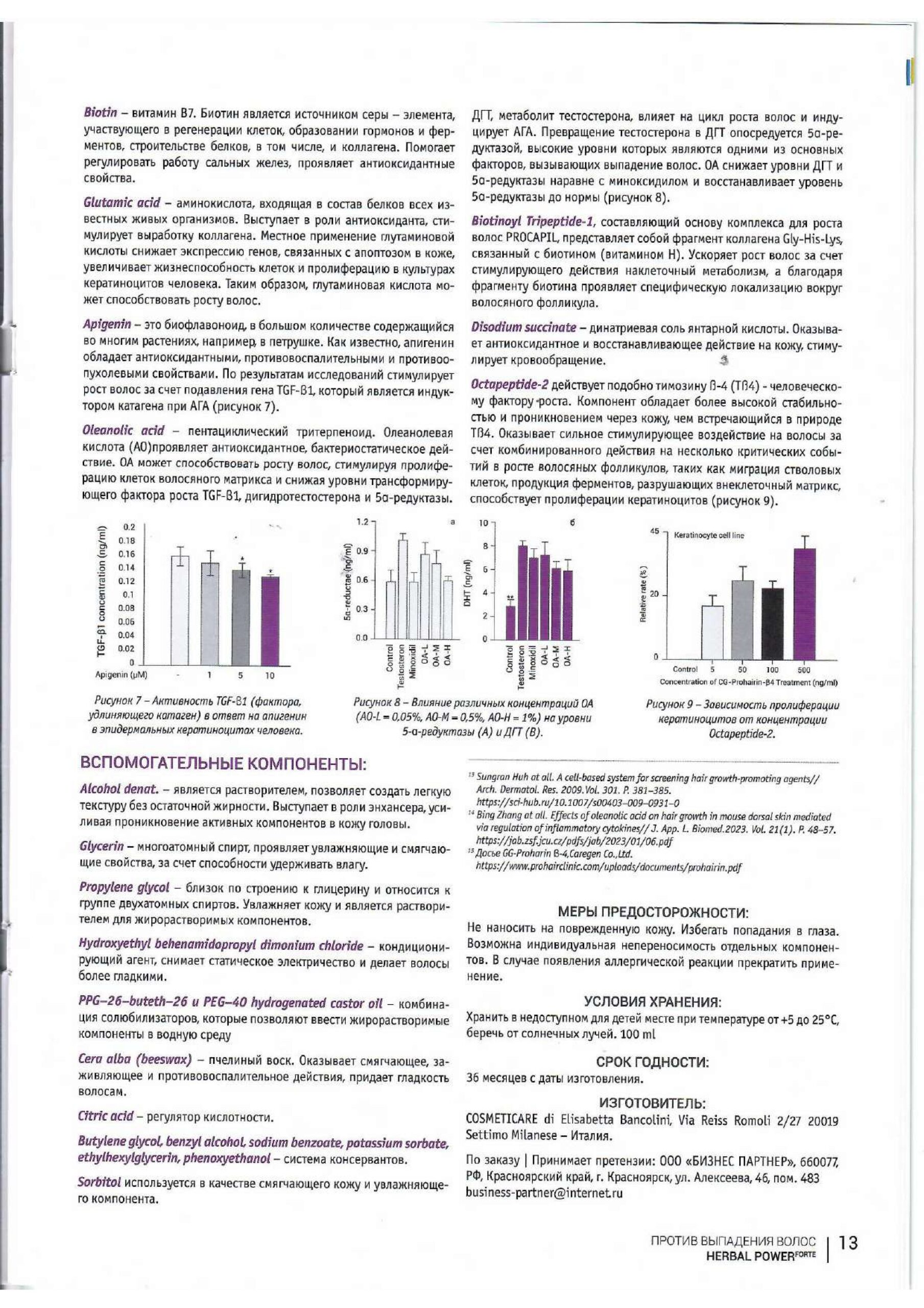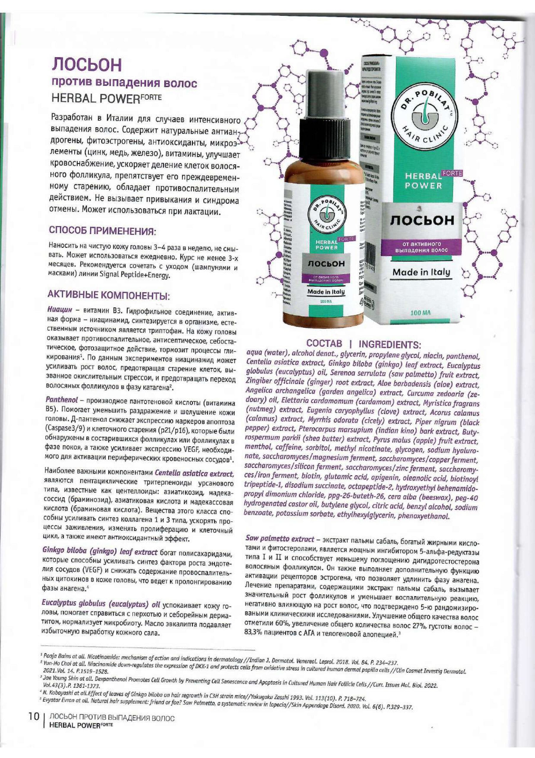 Разработан в Италии для стимуляции роста волос и предотвращения выпадения. Показан при замедлении роста, истончении стержней. Содержит экстракты лекарственных растений, стимулирует микроциркуляцию, насыщает энергией клетки волосяного фолликула, продлевает фазу анагена (жизни). Препятствует повреждению клеток вследствие окислительного стресса. Не вызывает привыкания и синдрома отмены. Может использоваться при лактации.