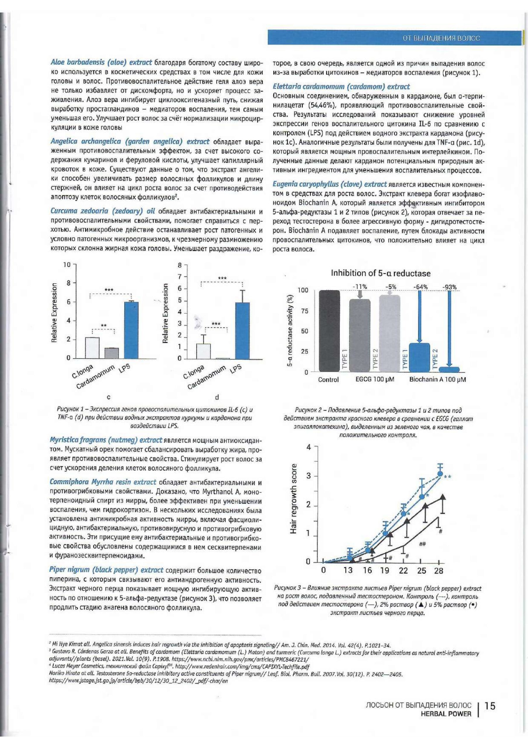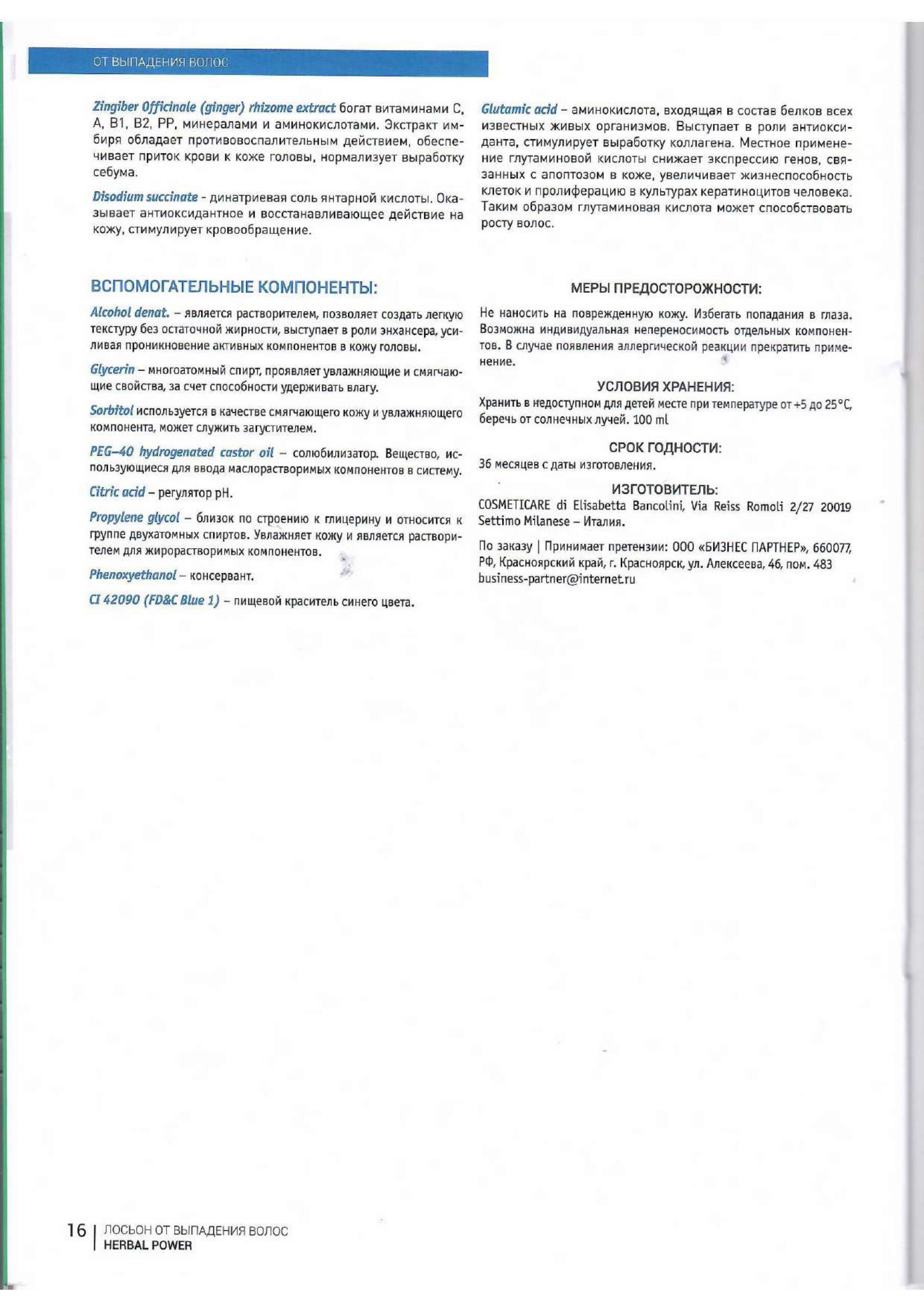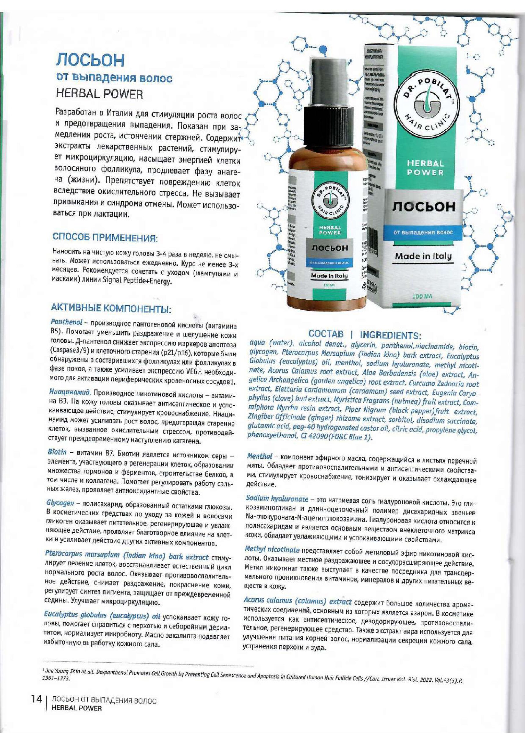 Разработан в Италии для стимуляции роста волос и предотвращения выпадения. Показан при замедлении роста, истончении стержней. Содержит экстракты лекарственных растений, стимулирует микроциркуляцию, насыщает энергией клетки волосяного фолликула, продлевает фазу анагена (жизни). Препятствует повреждению клеток вследствие окислительного стресса. Не вызывает привыкания и синдрома отмены. Может использоваться при лактации.