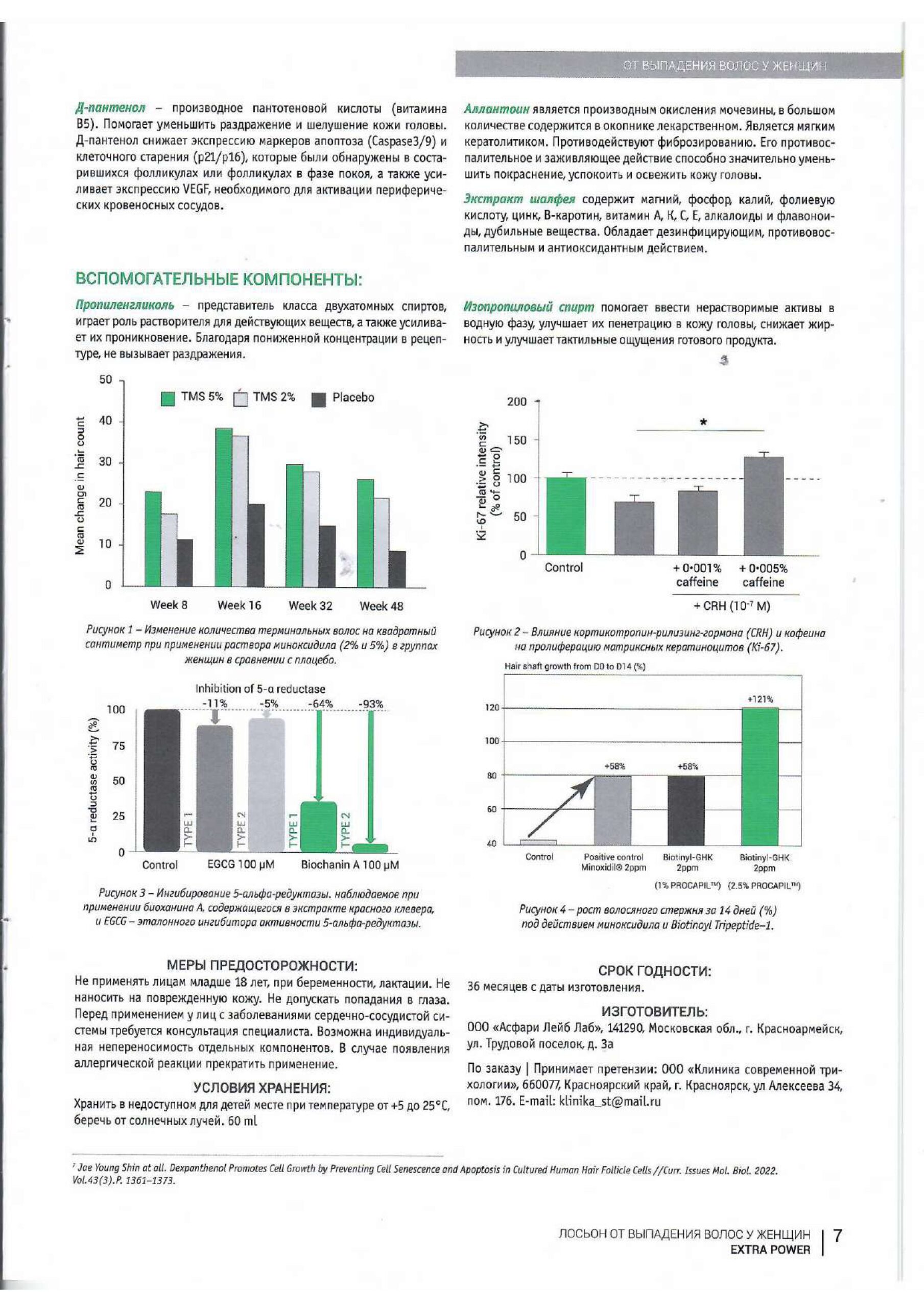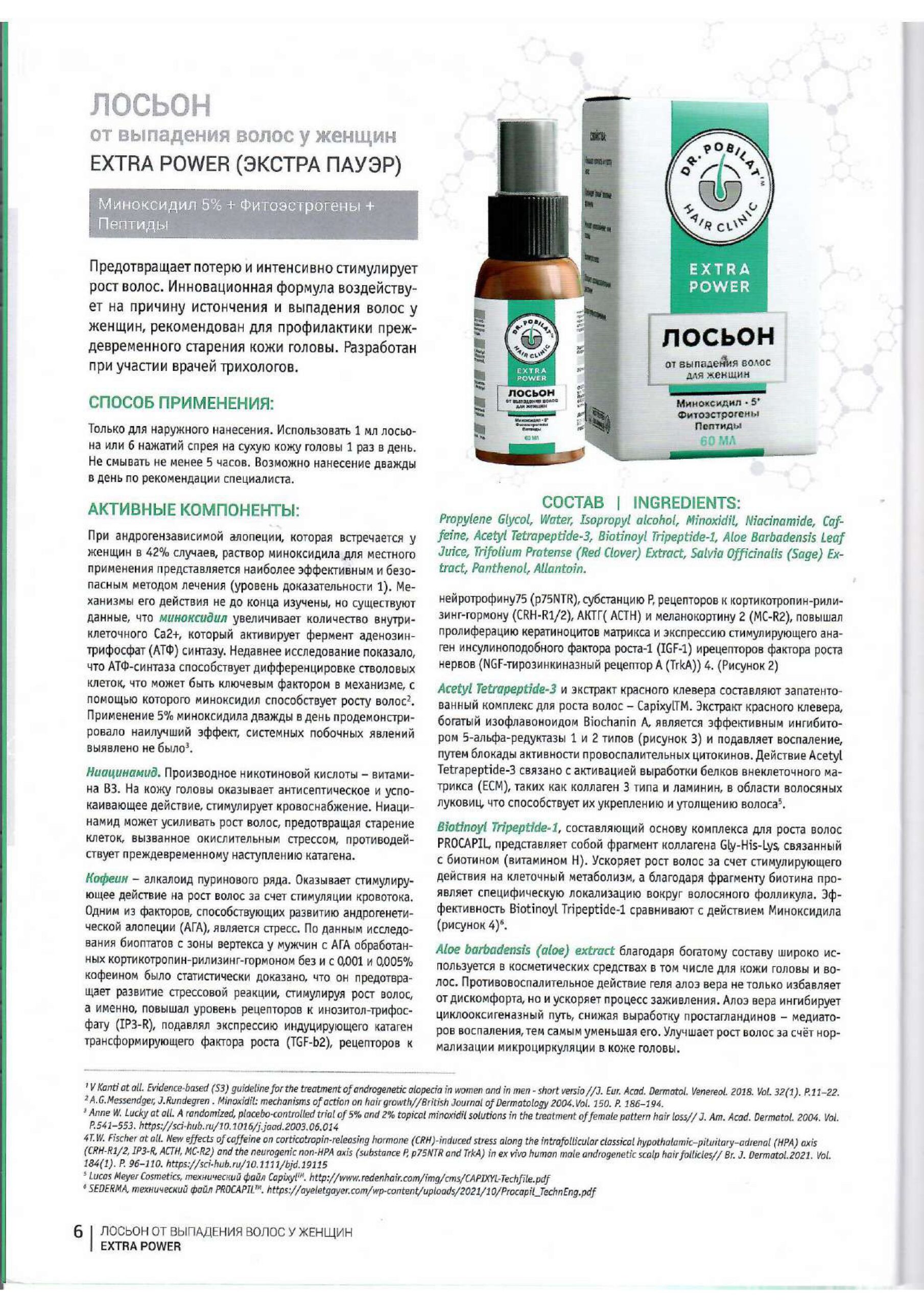 Лосьон от выпадения волос у женщин EXTRA POWER сочетает 5% миноксидил, фитоэстрогены и пептиды для предотвращения потери волос и стимуляции их роста. Разработанный при участии врачей-трихологов, он воздействует на причины истончения и выпадения волос, улучшая кровоснабжение кожи головы и пробуждая «спящие» волосяные фолликулы. Лосьон повышает плотность и густоту волос, ускоряет их рост и обладает противовоспалительным действием. Рекомендуется для регулярного применения и профилактики преждевременного старения кожи головы.